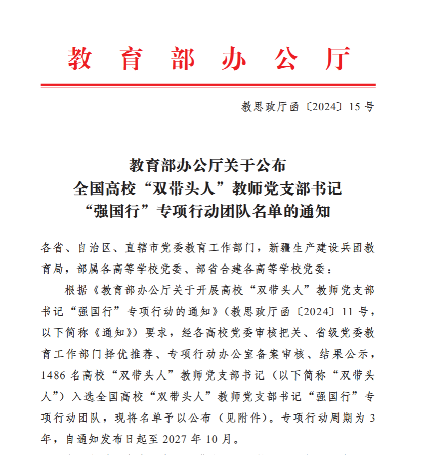 当前位置: 首页 >> 党群工作 >> 正文 祝贺!我校国合基地党支部入选 全国高校“双带头人”教师党支部书记“强国行”专项行动团队 时间:2024年10月29日 10:43 作者:国合基地 近日,教育部思政司印发了《关于公布全国高校“双带头人”教师党支部书记“强国行”专项行动团队名单的通知》,我校国合基地党支部(人工智能学院教工第四党支部)入选。本次全国共1486支党支部入选,重庆共31支。 这是国合基地继2023年获批市级第二批党建“双创”样板支部、2024年获批全国第四批党建“双创”样板支部后,支部高质量党建工作实现的新突破。荣誉与突破的背后是支部全体党内外同志的努力与拼搏,国合基地党支部是一支凝心聚力、团结向上、勇于担当、甘于奉献的国际化科研队伍。 教育部高校组织开展的“双带头人”教师党支部书记“强国行”专项行动,旨在创新落实立德树人根本任务,充分发挥高校“双带头人”的示范引领作用,推进教育、科技、人才“三位一体”协同融合发展,引导广大师生在以中国式现代化全面推进强国建设、民族复兴伟业新征程上砥砺新担当、展现新作为。 国合基地积极落实习近平总书记在党的二十大报告中提出的“教育、科技、人才是全面建设社会主义现代化国家的基础性、战略性支撑”的要求,近年来严格对标“七个有力”标准,按照“1554”党建工作思路,在党建引领人才培养、科技创新上下功夫、做文章,充分发挥国际科技合作的“桥头堡”优势,建强支部战斗堡垒,扎实推进“一融双高”。 上一条:国合基地在学校党支部书记微党课比赛中获佳绩 下一条:重温峥嵘奋斗岁月,感受先辈奉献精神---国合基地(人工智能学院教工第四支部)开展行走中的红色思想教育 【关闭】